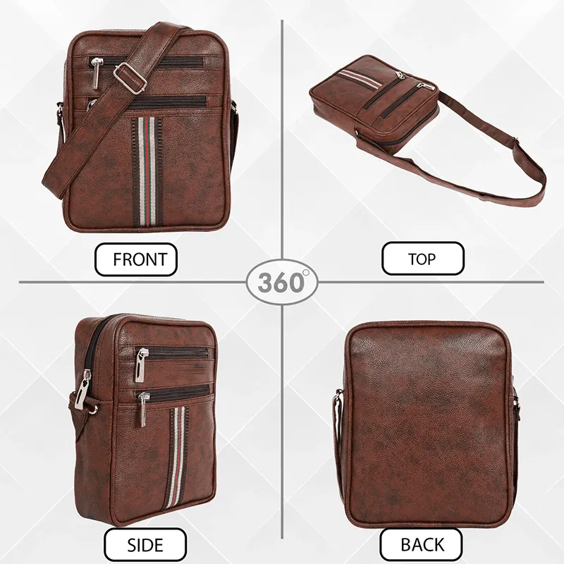 Premium brown leatherette tablet sling bag available for bulk orders with custom logo branding. Compact office messenger bag with multiple front zipper pockets, adjustable strap and premium finish—ideal for corporate gifting and promotional events.