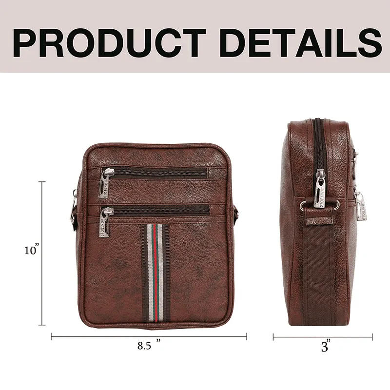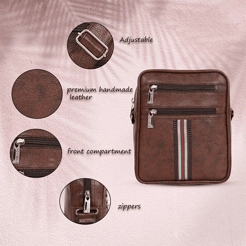 Premium brown leatherette tablet sling bag available for bulk orders with custom logo branding. Compact office messenger bag with multiple front zipper pockets, adjustable strap and premium finish—ideal for corporate gifting and promotional events.