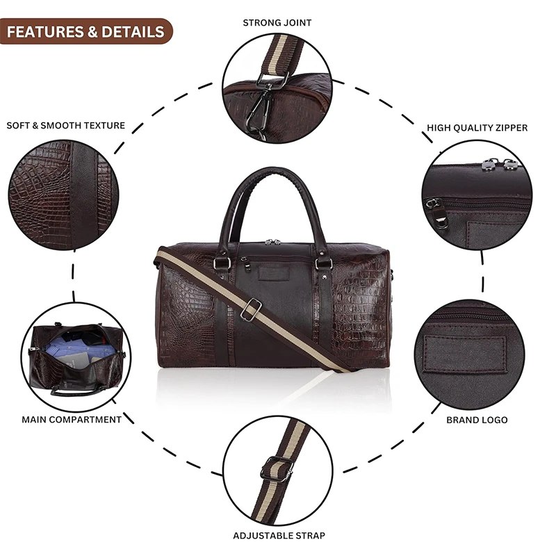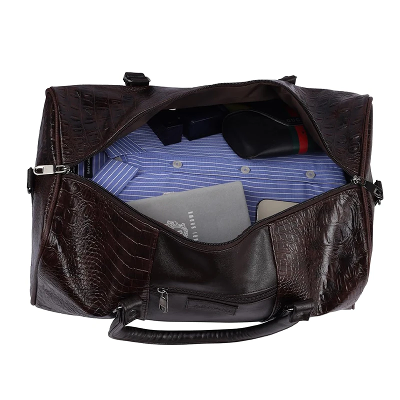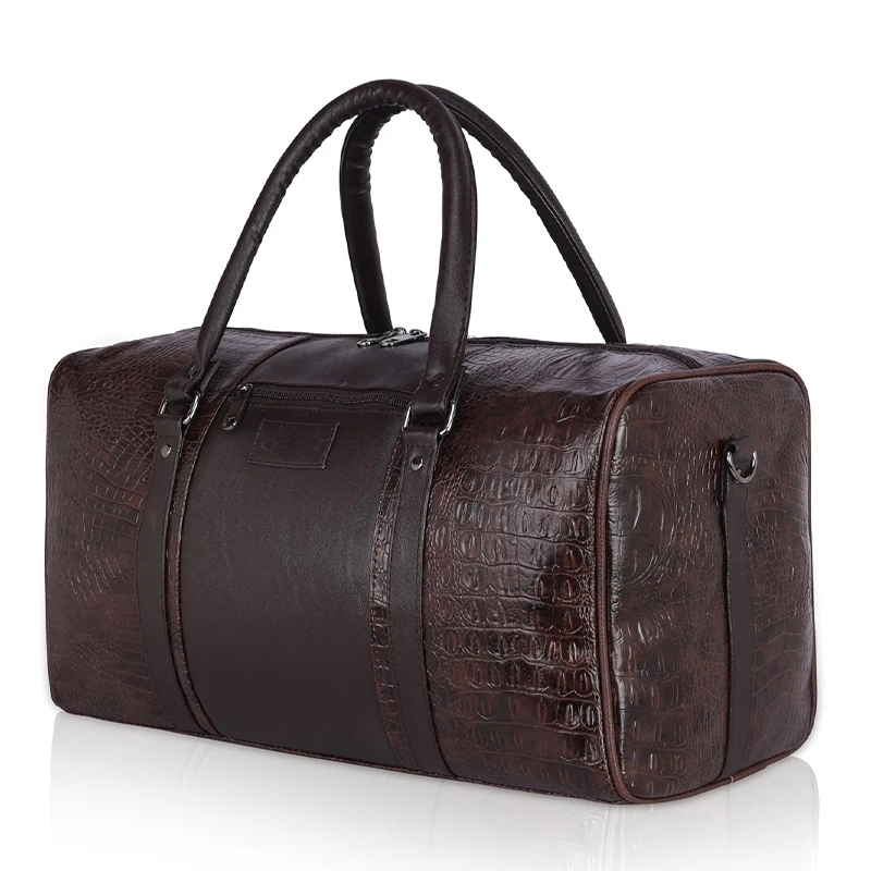 Order premium dark brown croco texture duffle bags in bulk with custom logo branding for corporate gifting, executive travel kits, employee gifting, and promotional events. Spacious 18-inch travel bag with strong handles, detachable strap and premium finish.
