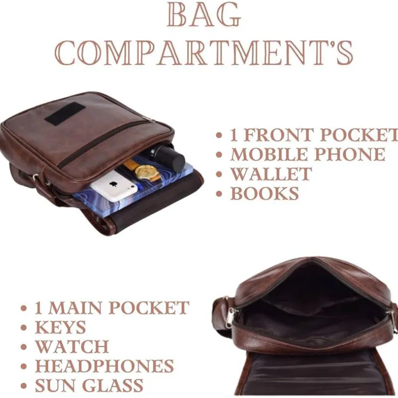 Made from durable leatherite fabric, this sling bag protects your belongings from dust, scratches, and light moisture. The spacious main compartment allows you to carry tablets, documents, chargers, notebooks, and other office accessories with ease. It also features additional pockets that help keep small items organized and easy to access.